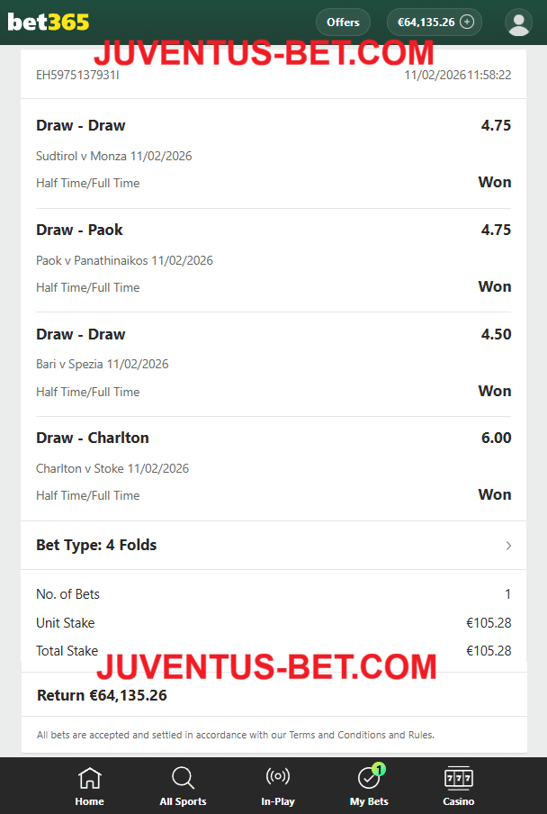 | 11.02.2026 | Sudtirol – Monza | X/X | 4.75 | 0:0 / 0:0 |